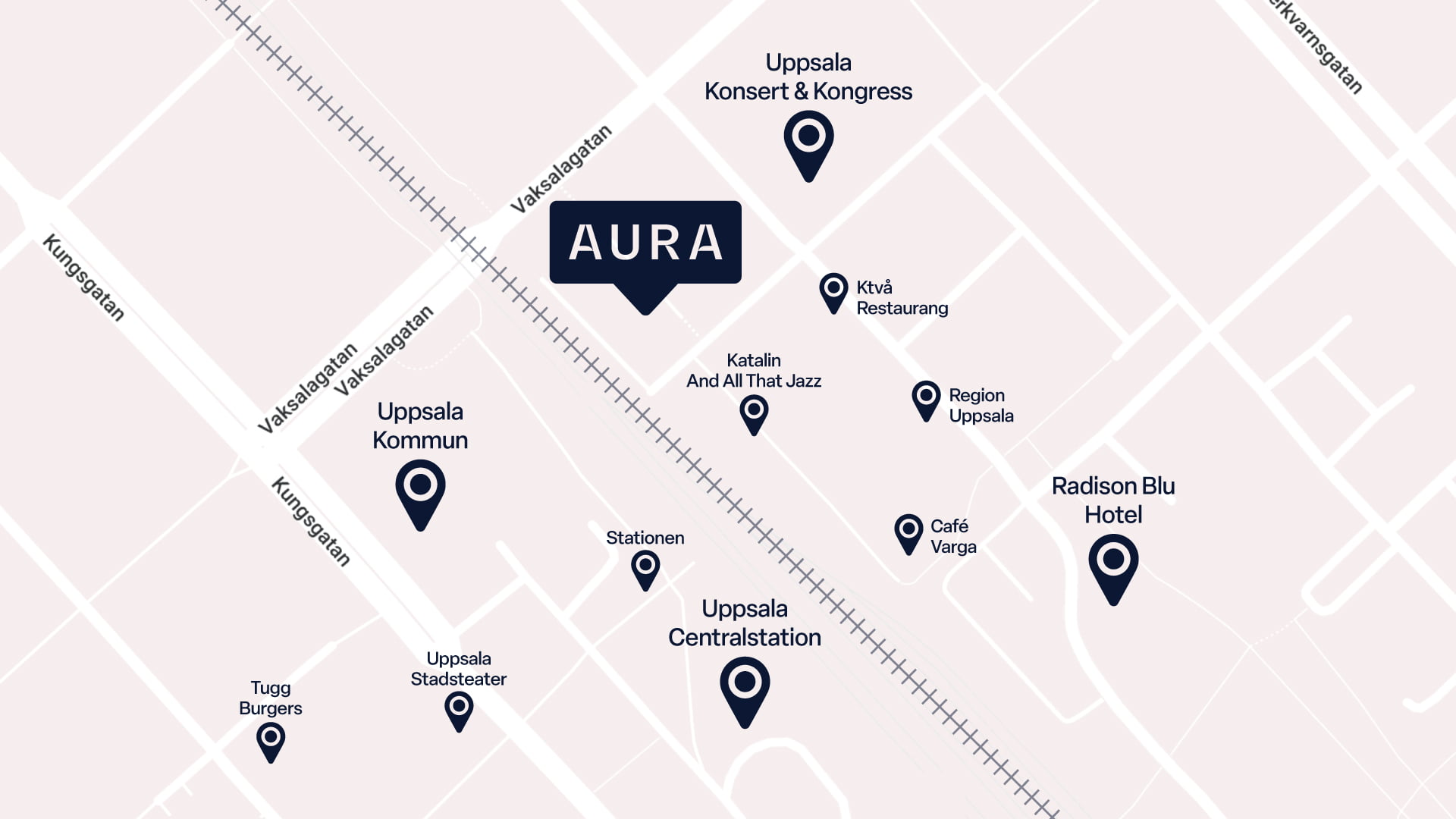 Aura uppförs mitt i Uppsalas stadskärna, granne med både Centralstationen och UKK. Kvarteret ramas in av Vaksalagatan, Storgatan, Roslagsgatan och järnvägsspåret. Här finns hela stadens utbud på gångavstånd, med restauranger, butiker och kulturupplevelser runt hörnet.